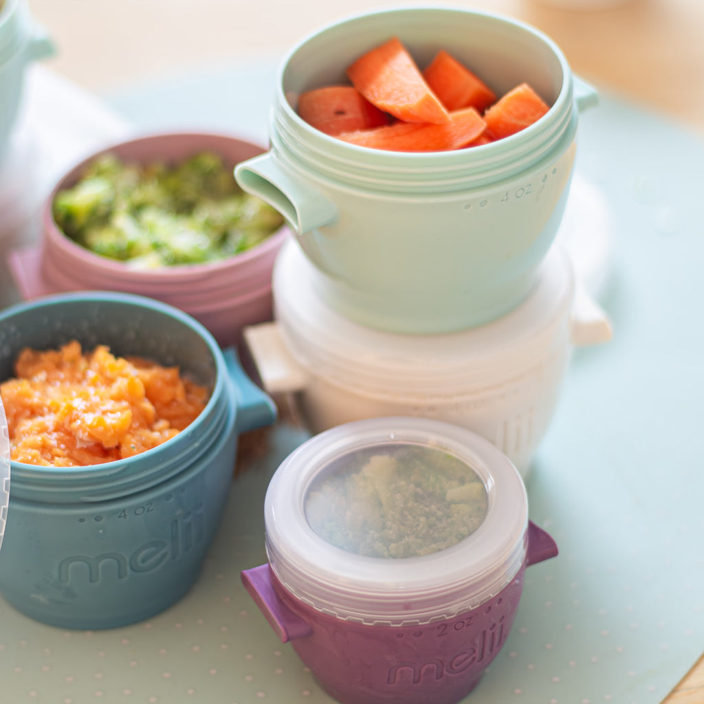 De flerfarvede beholdere gør måltiderne sjovere for de små og nemmere for dig. De kan stables lodret, hægtes sammen vandret og passer i selv den mest fyldte fryser. Brug dem fra første mos og langt ind i tumlingealderen.