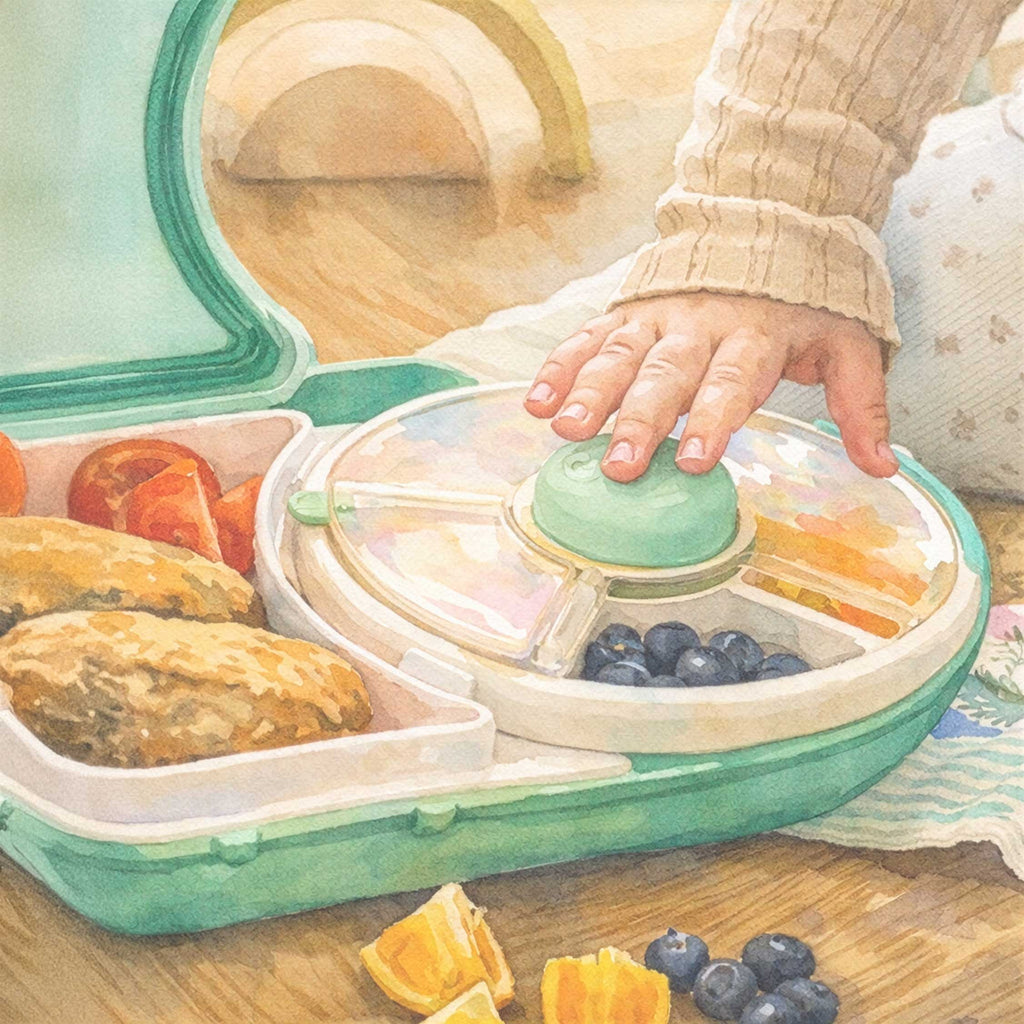 Den nye Snack Spinner fra GöBe Kids kombineret med en madpakke er ideel til større måltider. Madpakken har et rummeligt rum til en sandwich, mens snack spinneren med 5 mindre rum er perfekt til frugt, grøntsager, bær og snacks. Spinneren roterer, når du trykker på knappen, hvilket gør måltidet sjovt og lokker børn til at prøve nye fødevarer.
