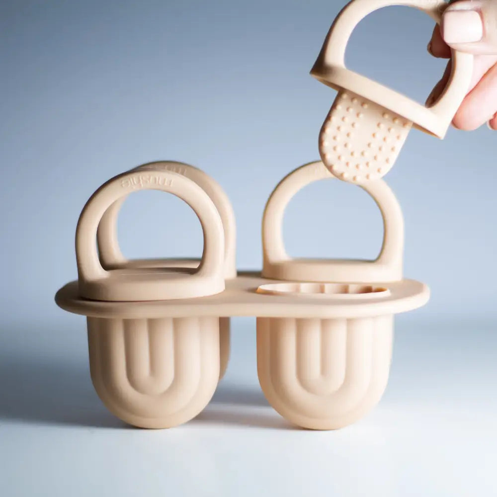 Gør snacktid sjovere med Mushie isform til børn. Formen har 4 rum og laver søde regnbueformede ispinde, perfekte til små hænder og store smil.