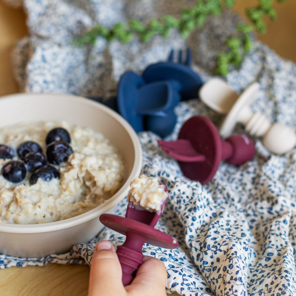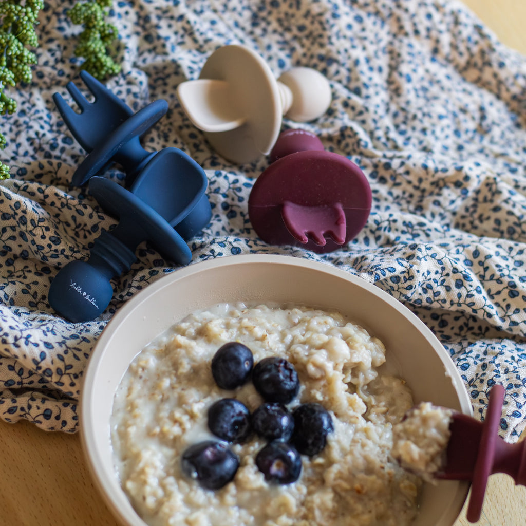 Designet med korte, ergonomiske håndtag, som gør det nemt for din baby at lære at spise selv. Chokerbeskyttelse forhindrer, at bestikket føres for langt ind i munden – ekstra tryghed til måltidet.